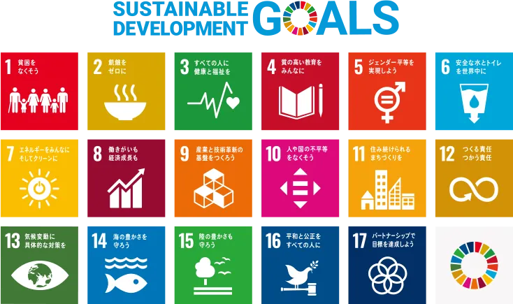 2015年9月の「国連持続可能な開発サミット」で採択された2030年までの国際的な目標です。持続可能な世界を実現するための17のゴール・169のターゲットから構成され、地球上の誰一人として取り残さない(Leavenoonebehind)ことを誓っています。
