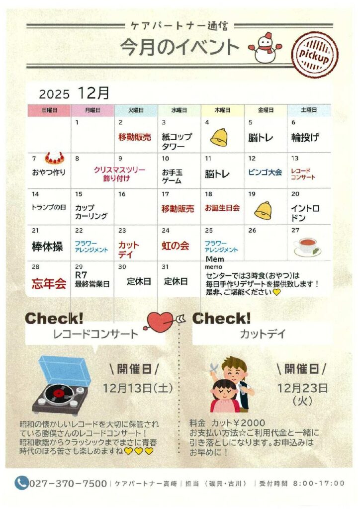 | 高崎センターの特徴 | ①【機能訓練がたいせつ】トレーニグマシン3機種配備、介護予防体操も好評いただいております。水圧式マッサージ器・フットマッサージャー等快適なリラクゼーションもお楽しみいただけます。 ②【医療対応がたいせつ】常勤の看護師が2名在籍しており、お客様の健康状態の確認、服薬管理、口腔ケア、医療処置・対応が充実しております。経管栄養・痰吸引・在宅酸素等幅広く対応しております。認知症サポーターも在籍しております。 ③【美味しい食事がたいせつ】栄養バランスの良い昼食(2種より主菜をお選びいただけます・おもてなし御膳・郷土料理)・バリエーションの3時食・おたのしみ夕食弁当(ご家族様分もお届けします)すべてカロリーや塩分制限、おかゆや刻み食の対応しております。 |