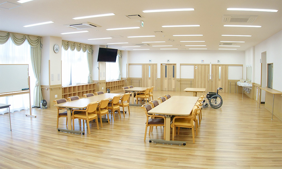 お客様の声、スタッフの声、様々な専門家のアドバイスを取り入れて作られた、 明るいデイサービスルームや広い浴室などの充実したファシリティでお客様をお迎えします。