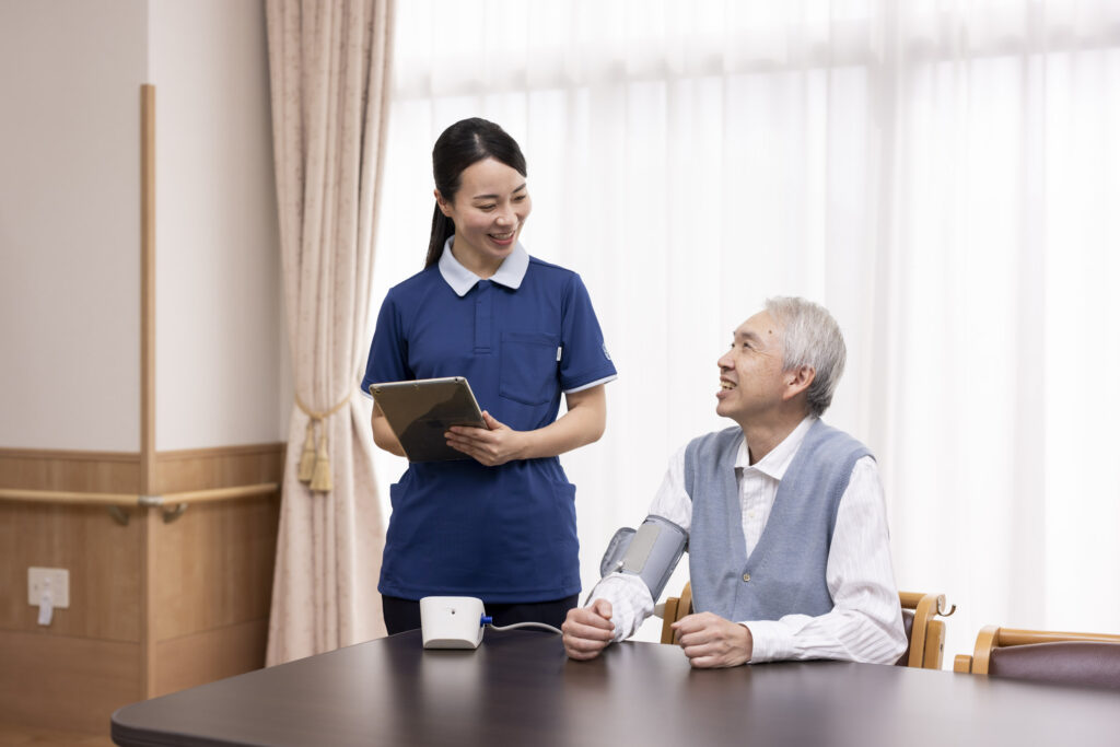 センター到着後、看護師による健康チェックを行います。体温、血圧、脈拍などを測定し、表情や声色の異変などの体調の変化を把握してから、センターでの1日を安全に心地よく過ごしていただきます。